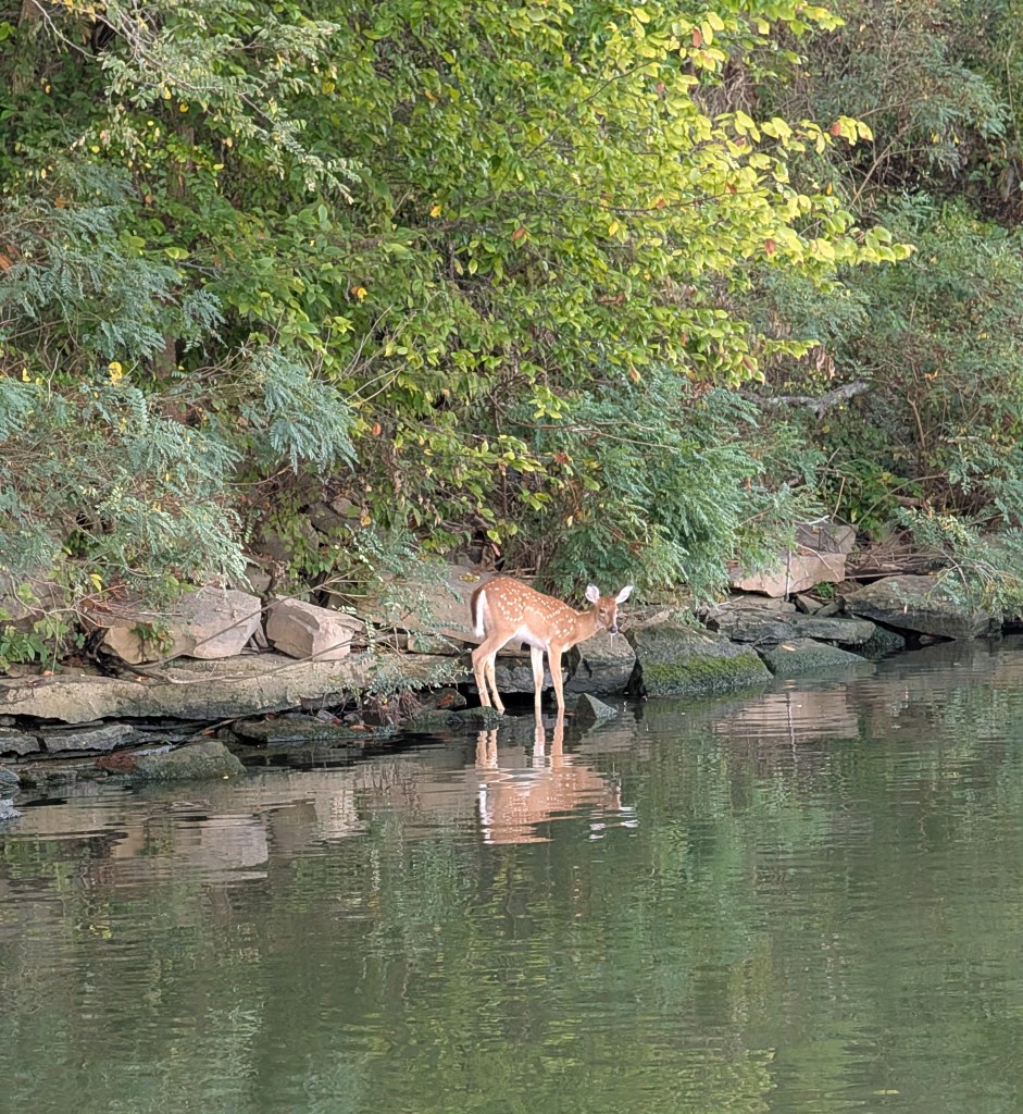 I started on the Kentucky side just south of Boone’s Landing, letting the current do most of the work. Picked off a few small bass along the rocks. A baby deer even wandered down to watch me fish, which was a nice bonus photo op. The fishing wasn’t great, so I crossed over to the Indiana side near Patriot.